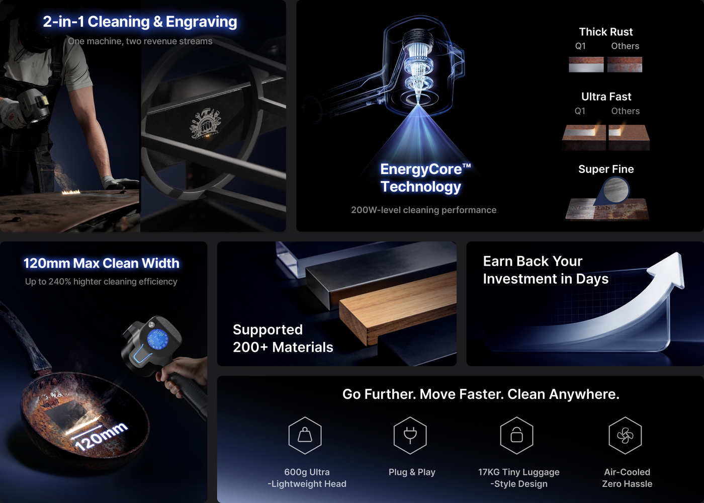 Instantly toggle between deep-cleaning mode and high-speed 6000 mm/s engraving. Build two businesses — cleaning & marking — using a single MOPA-powered system. Efficient, flexible, and built for contractors who want maximum ROI.